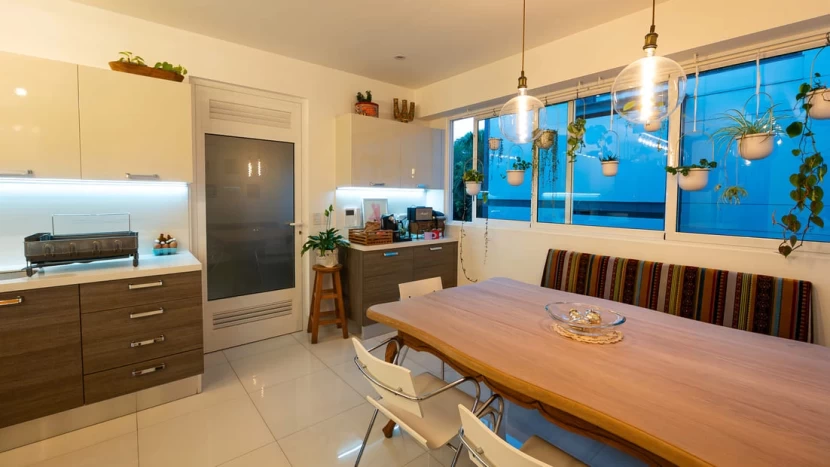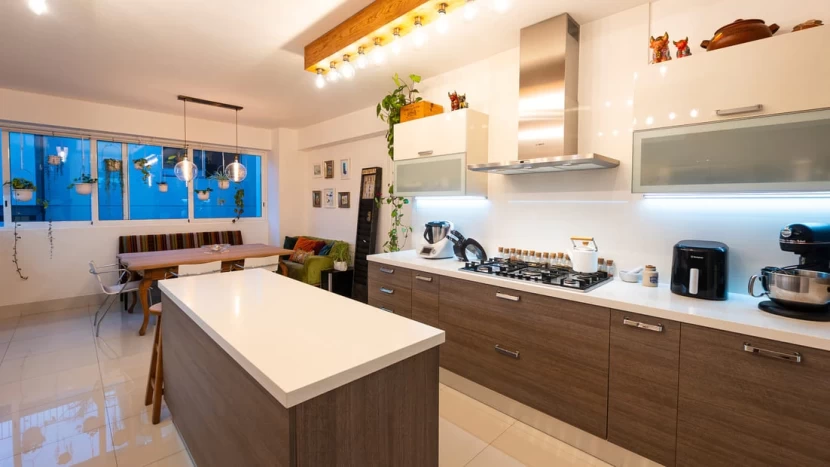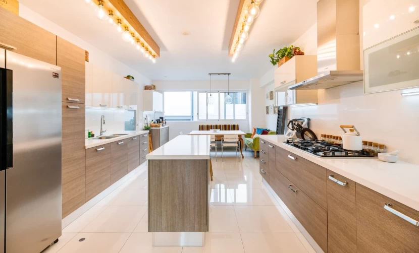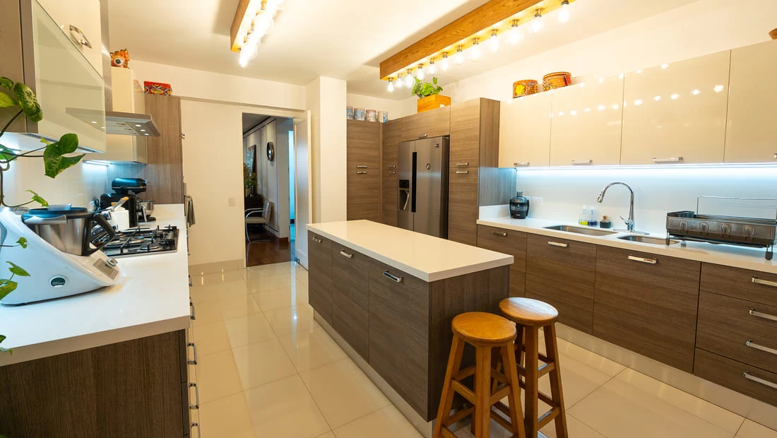 La cocina de autor —con mobiliario en poliuretano, sistema Blum y luz indirecta— ha sido pensada para quienes valoran la estética tanto como la funcionalidad.