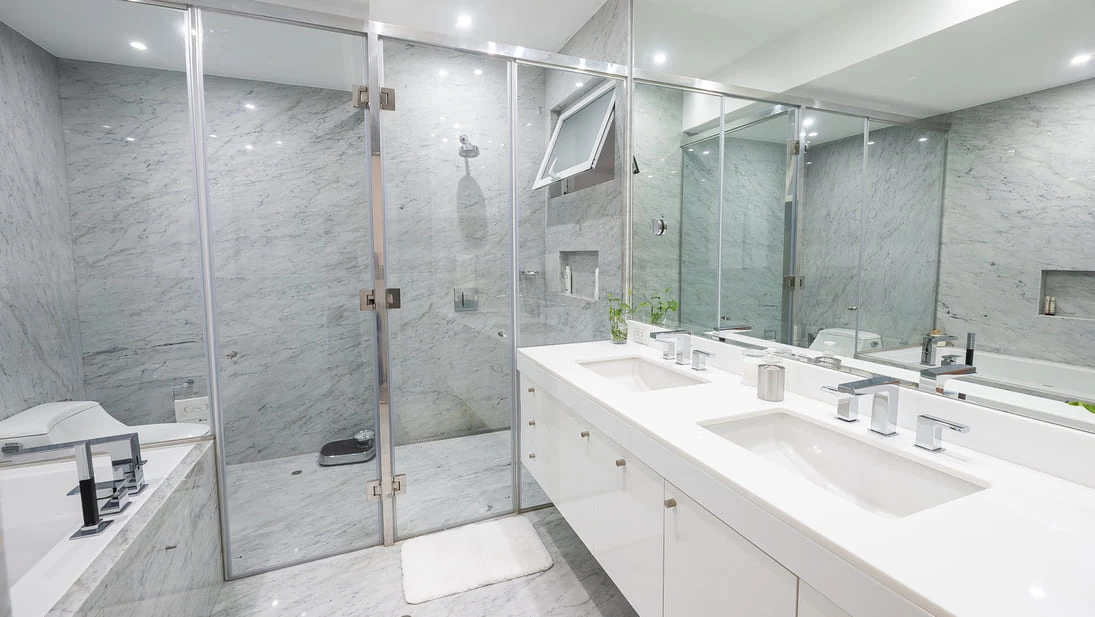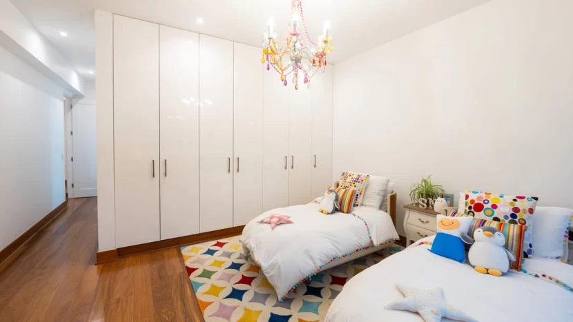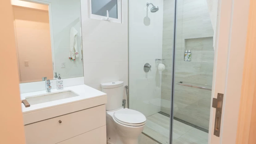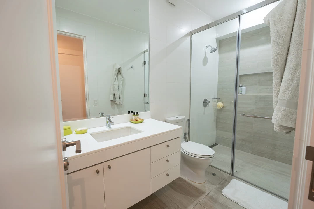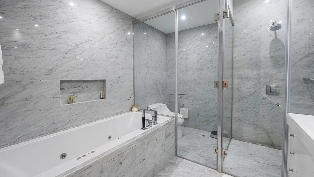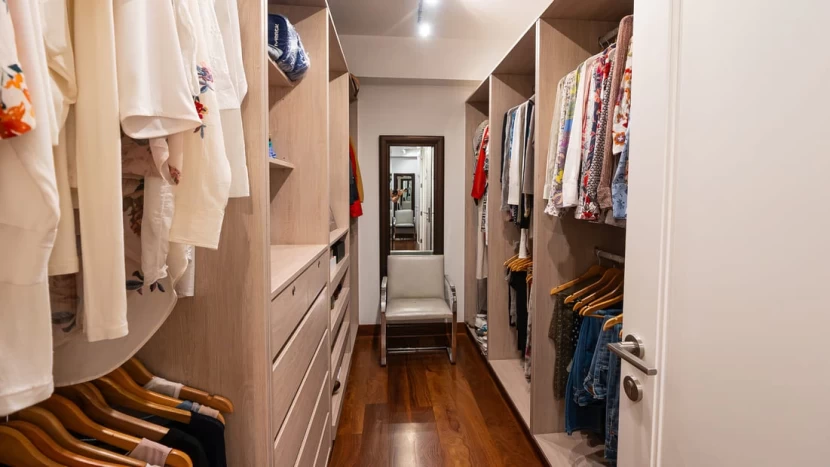 El dormitorio principal se concibe como un refugio privado: amplio, con doble walk-in closet y baño revestido en mármol con ducha y tina independiente.